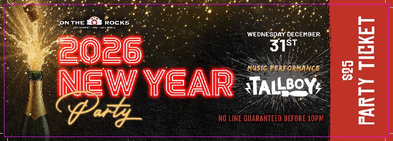 Your Party Ticket gets you access to On the Rocks after 9 PM – Party Favours, Bubbly at Midnight and LIVE Music by Edmonton’s own, Tallboy!